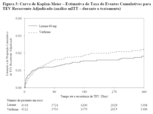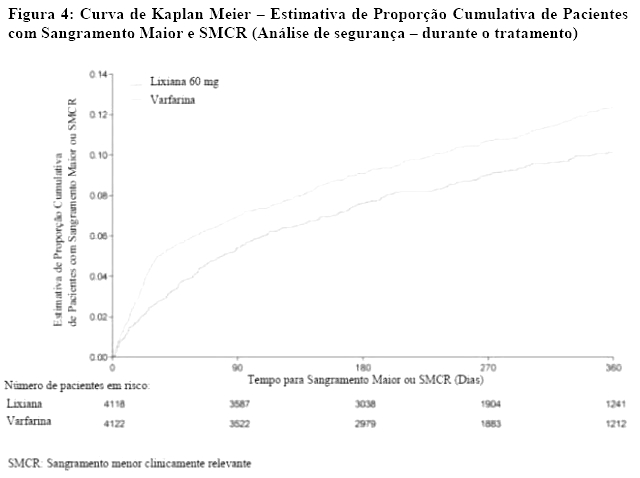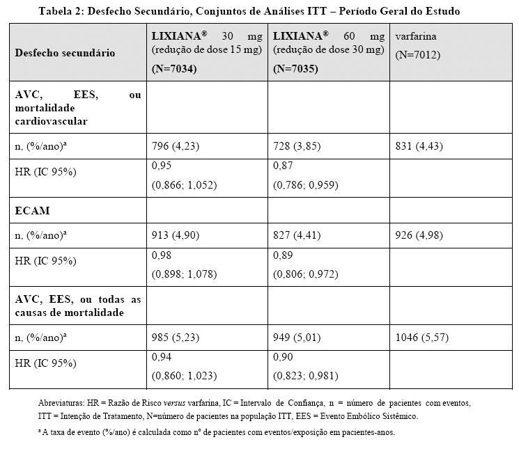 O tempo mediano de follow up para todos os grupos em uso de lixiana ® (60 mg e 30 mg) e varfarina foi de aproximadamente 2,8 anos... A mediana de pacientes expostos anualmente à droga foi de 15.471, 15.840 e 15.569 para os grupos de tratamento com lixiana ® …